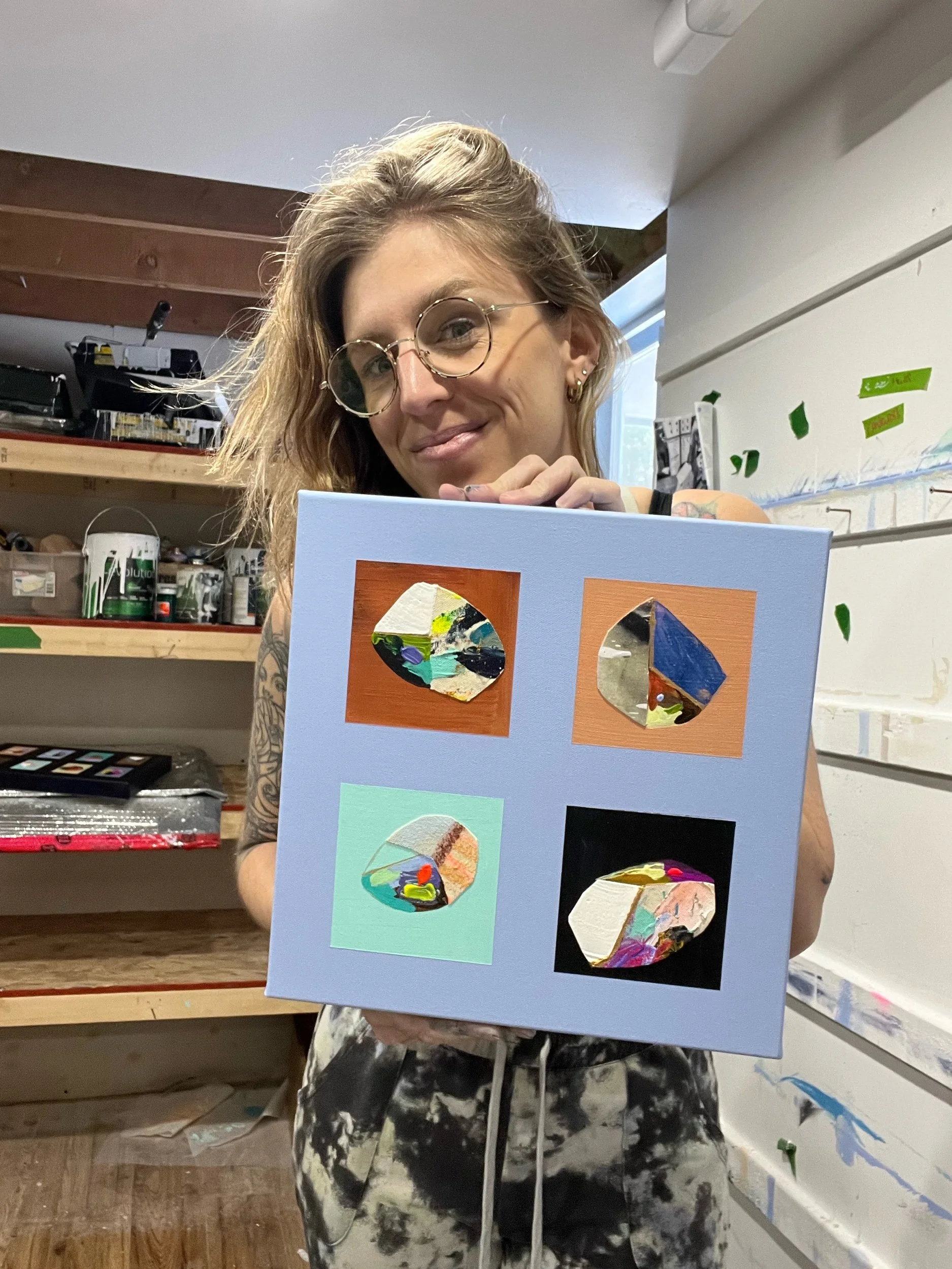 Original 10×10 inch artwork created using acrylic, oil, crayon, and mixed media on canvas. Each piece arrives ready to hang and is finished with a satin varnish for a subtle, refined sheen.
