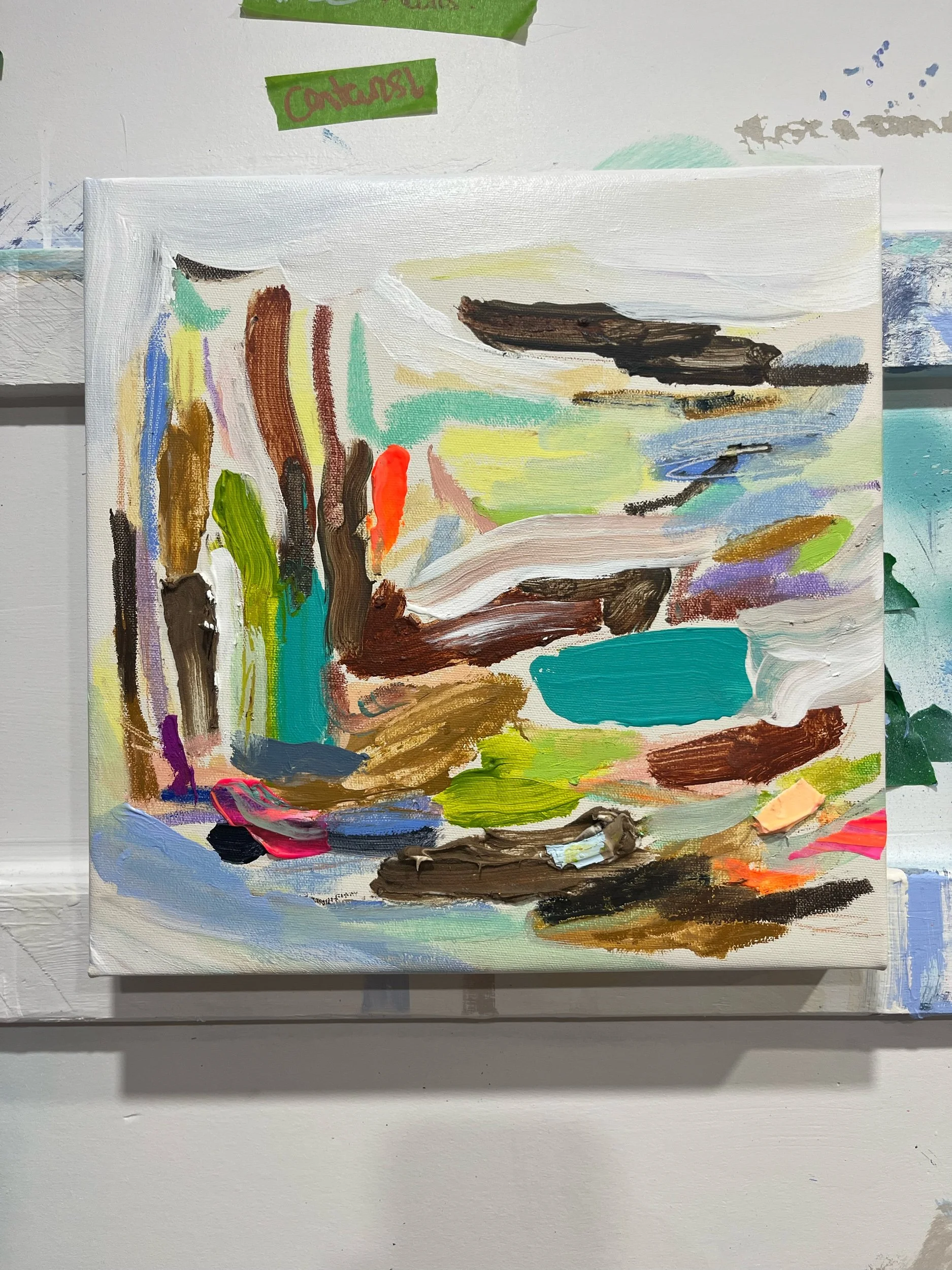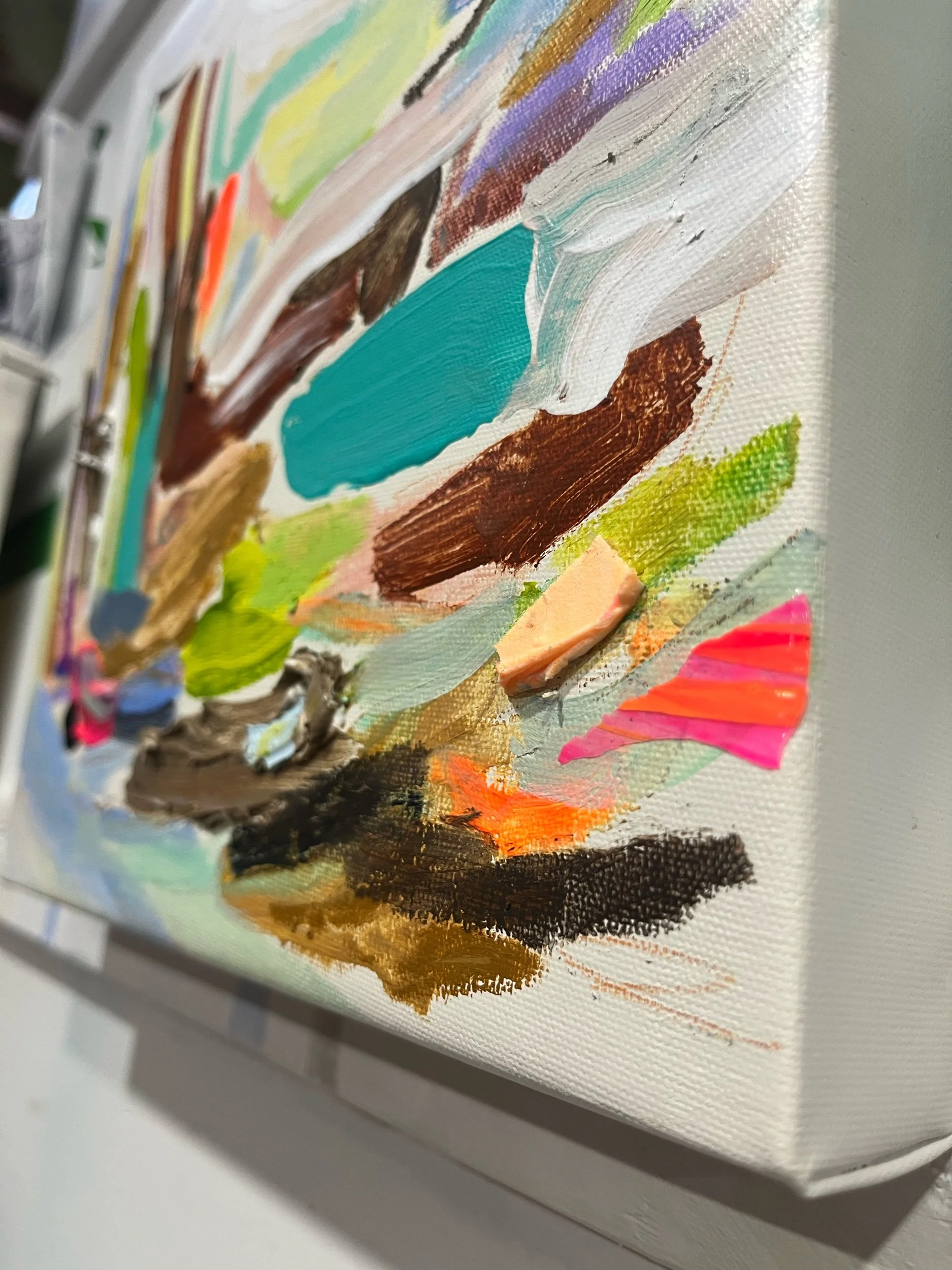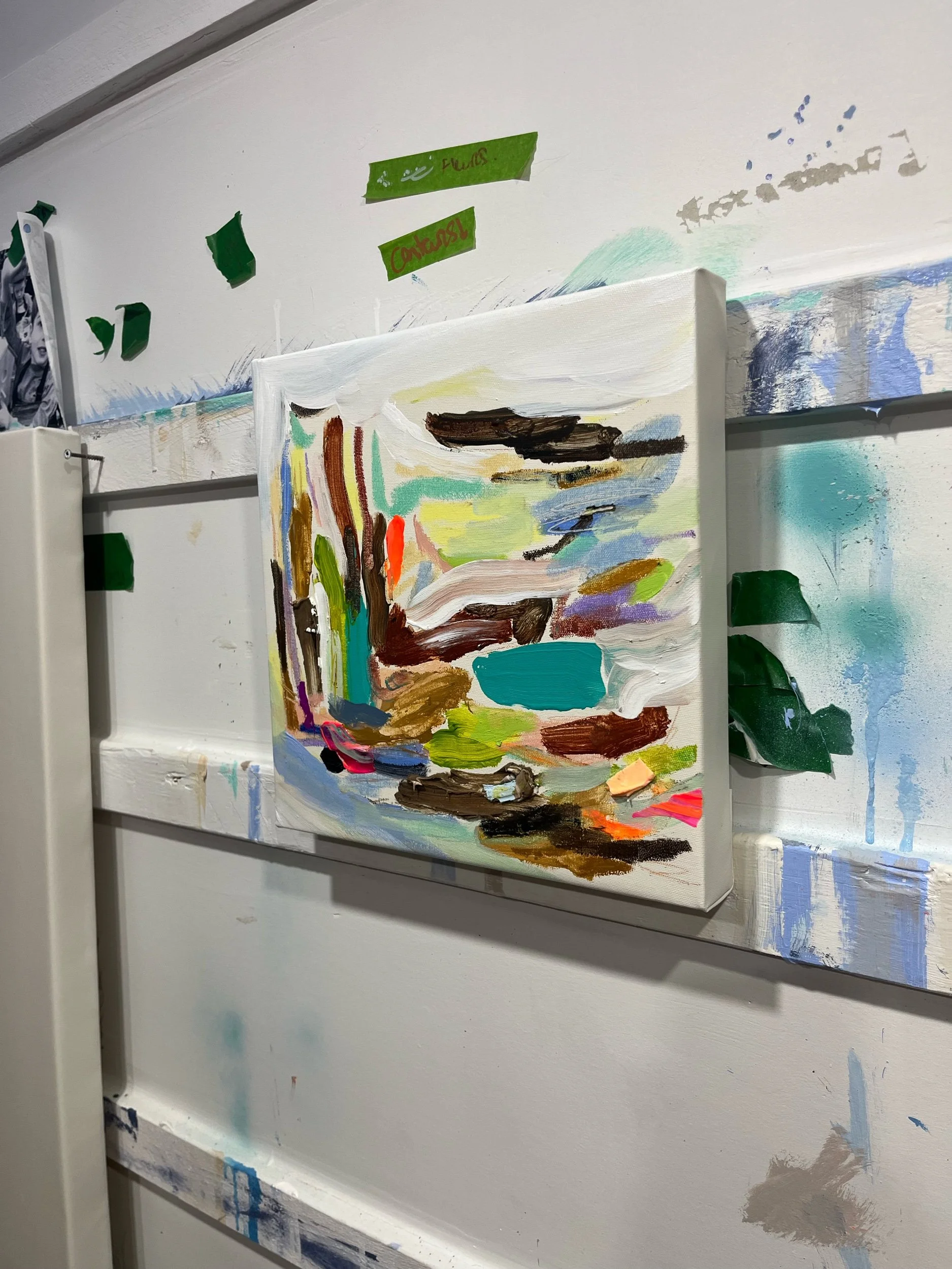 Inner Landscapes explores emotional terrains through layered oil stick and acrylic. Rich textures, fragments of dried paint from past works, and liberated gestures merge into abstract landscapes shaped by feeling rather than form.