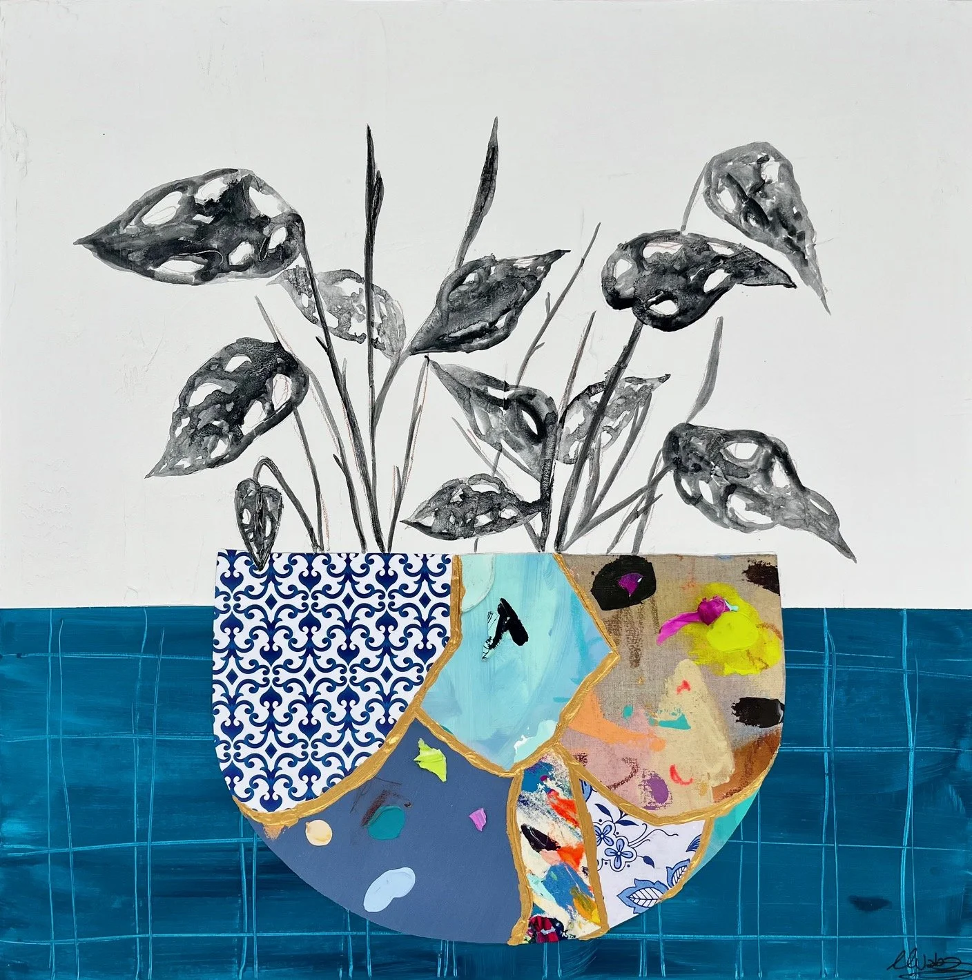 Les Pots Cassés assembles fragments of canvas into striking black-and-white floral scenes, highlighting colorful pots and touches of gold inspired by kintsugi. These works celebrate resilience, repair, and the poetry of reconstructed beauty.